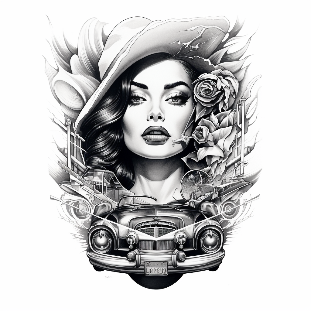 Embrace the rich heritage and artistic flair of Chicano culture with our exclusive limited edition tattoo design. This custom piece weaves together the timeless elements of a captivating woman with a hat, the iconic front end of a classic car, and the symbolism of roses.